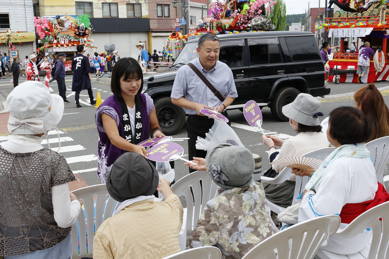 「のへじ祇園まつり」初日の山車合同運行(野辺地駅前広場)でうちわを配布しました。さらに司
