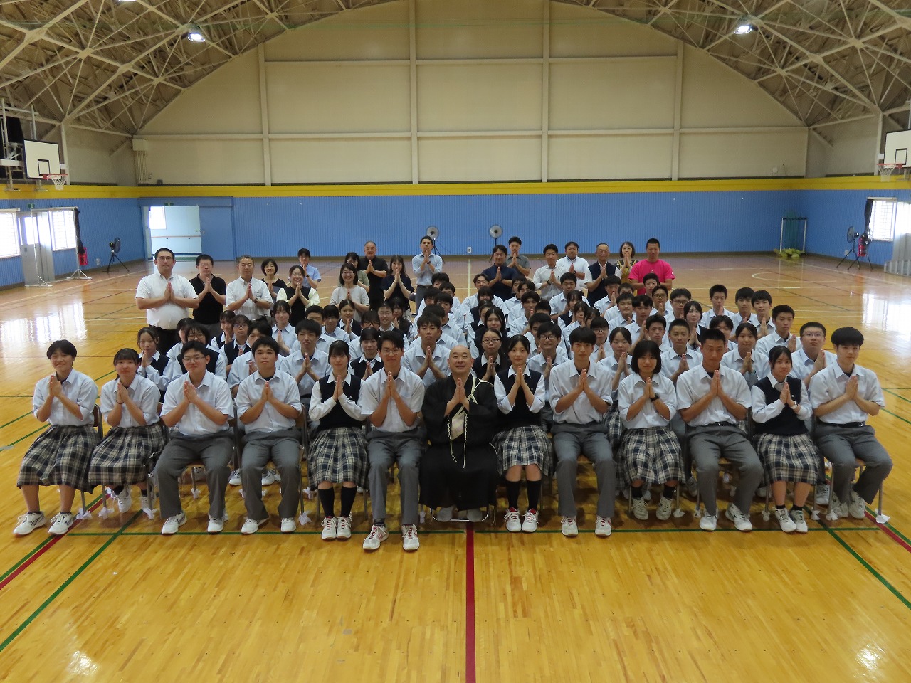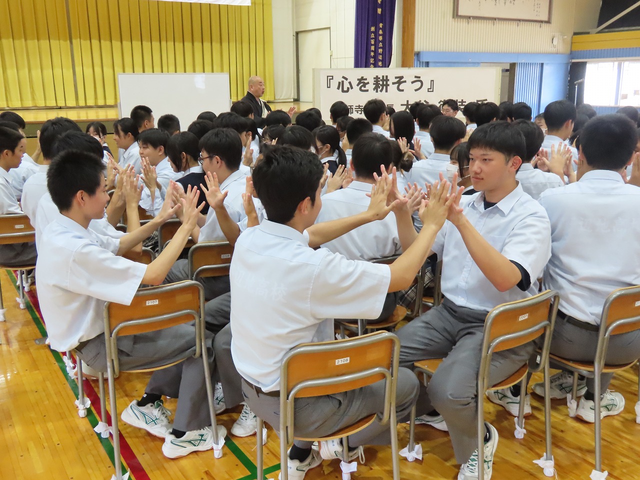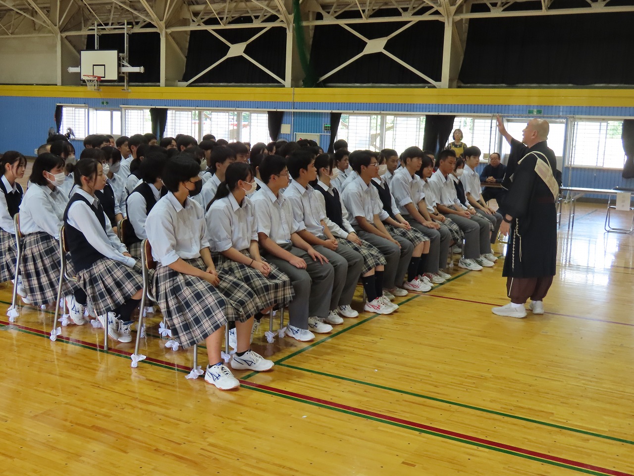 本校第二体育館で薬師寺僧侶法話が行われました。薬師寺の僧侶より「心を耕そう」という演題