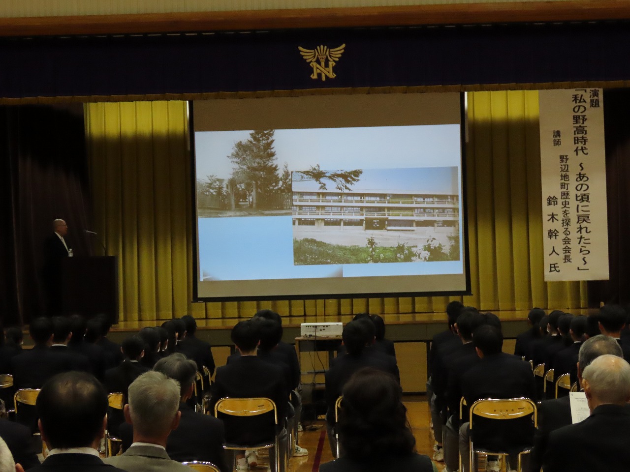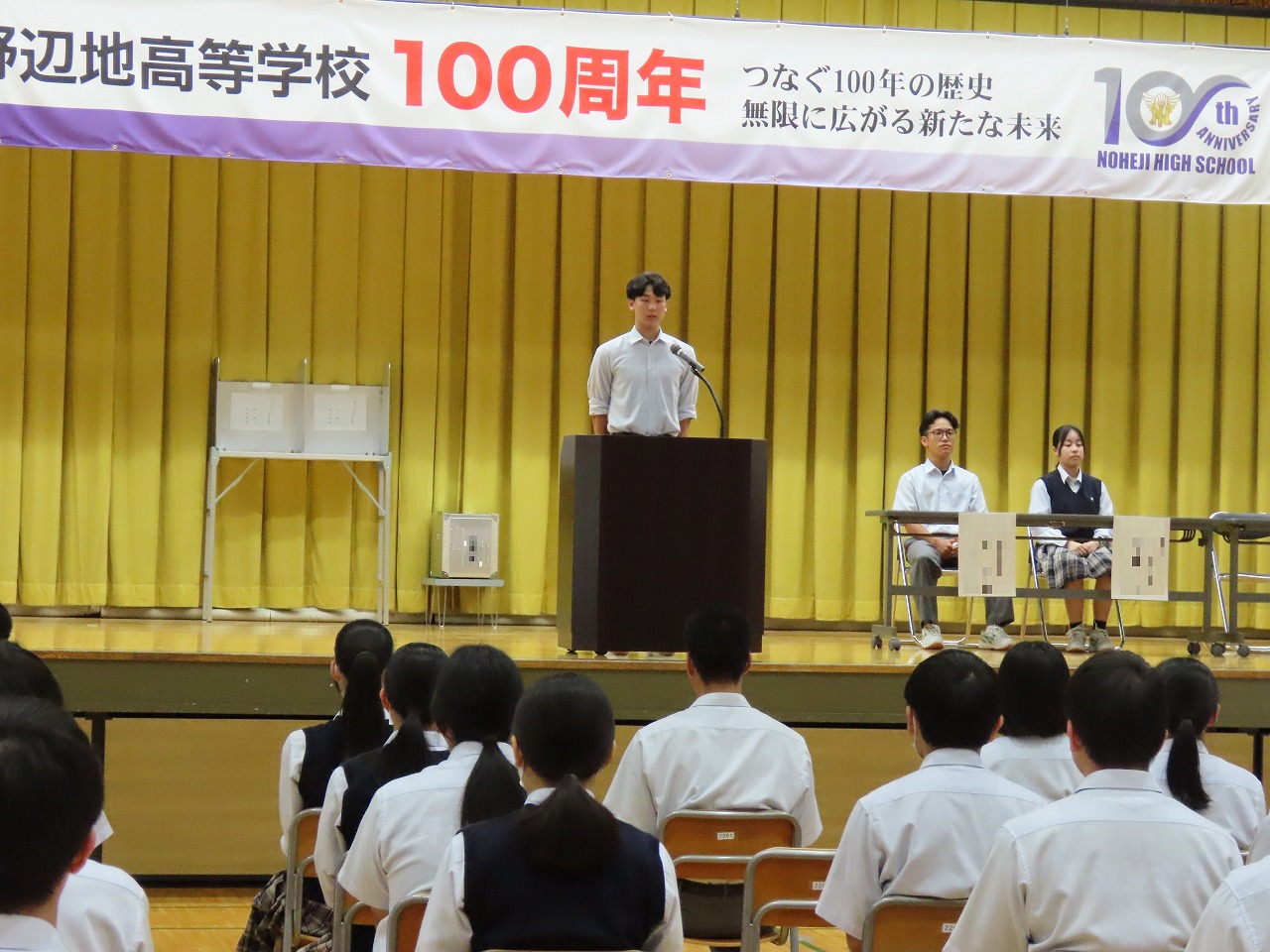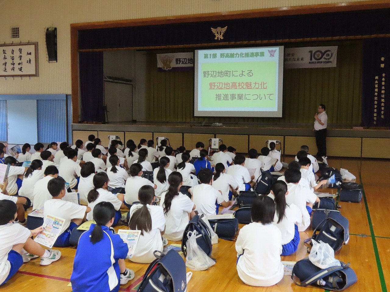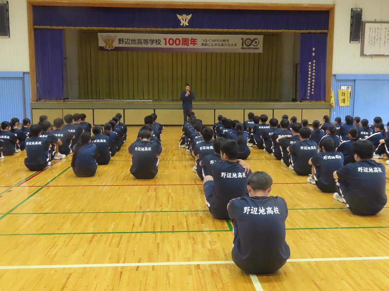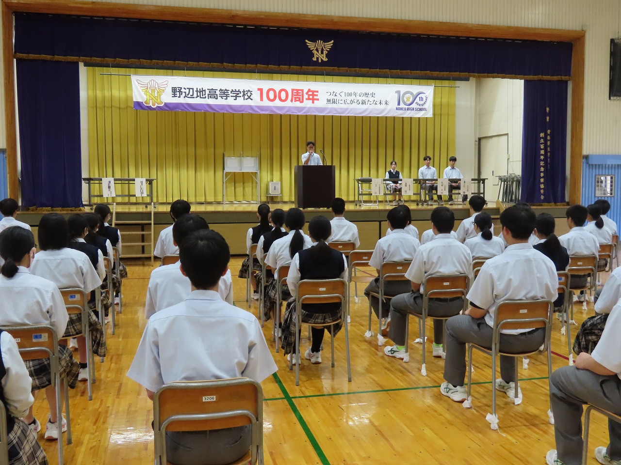 本校第二体育館で創立100周年記念式典と記念講演がが行われました。式典では、来賓や卒業生を