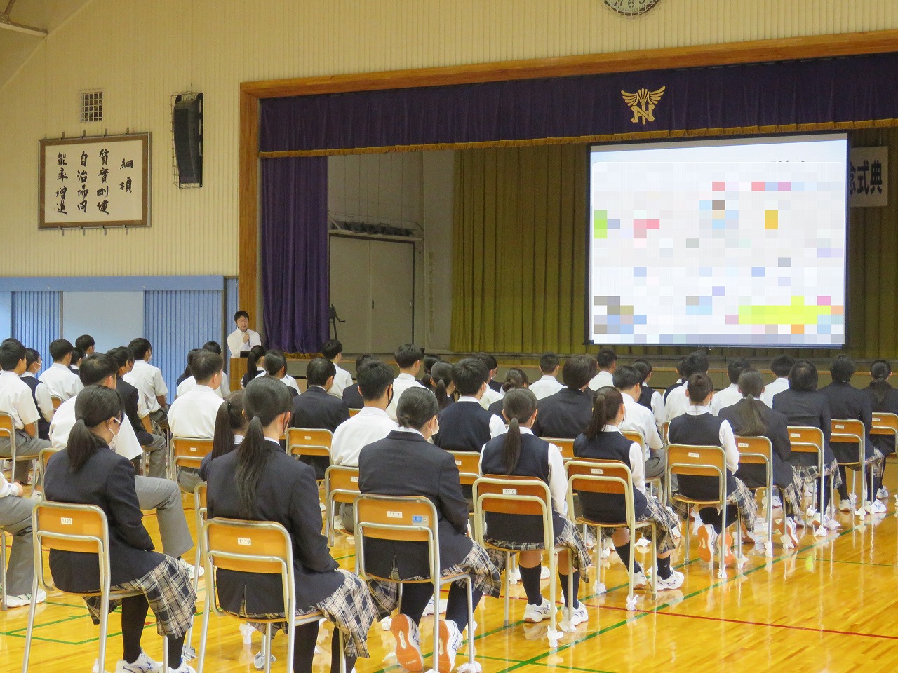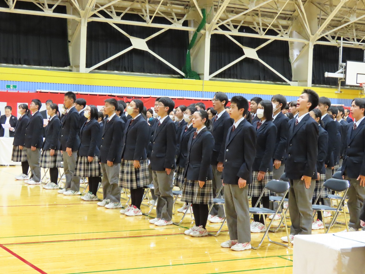 あり、その後生徒は元気よく校歌を斉唱しました。修了式の後には離退任式が行われま