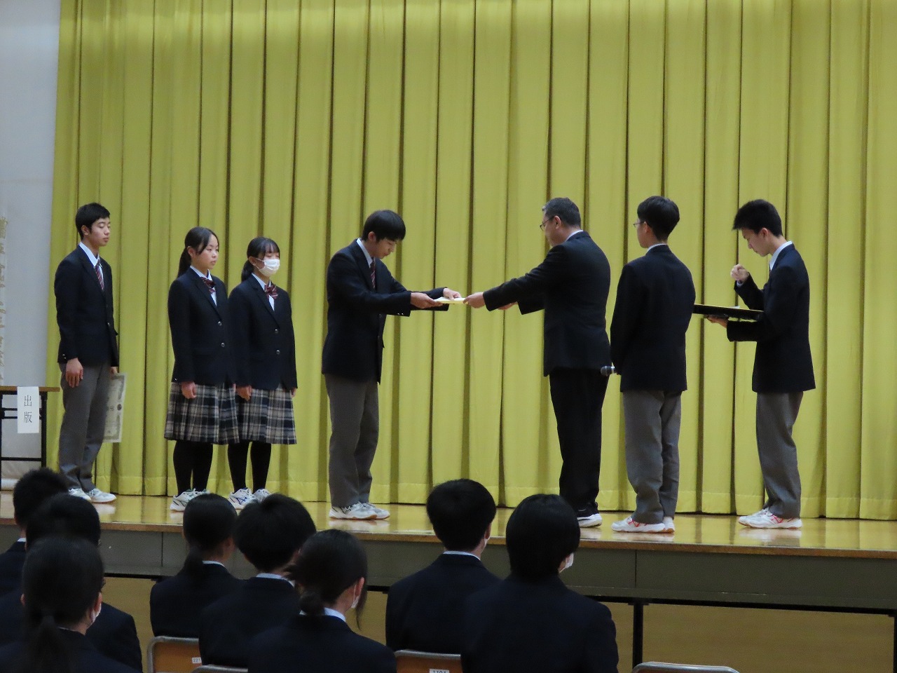 賞状伝達が行われました。ハンドボール部、バドミントン部、演劇部が表彰されました。