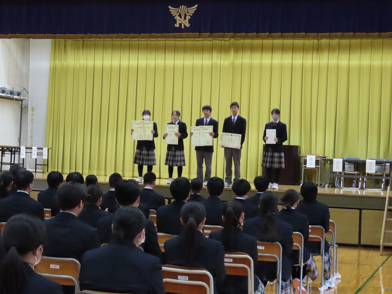 スキー部の生徒が表彰されました。その後、1,2年生の修了に伴う1か年の表彰式を