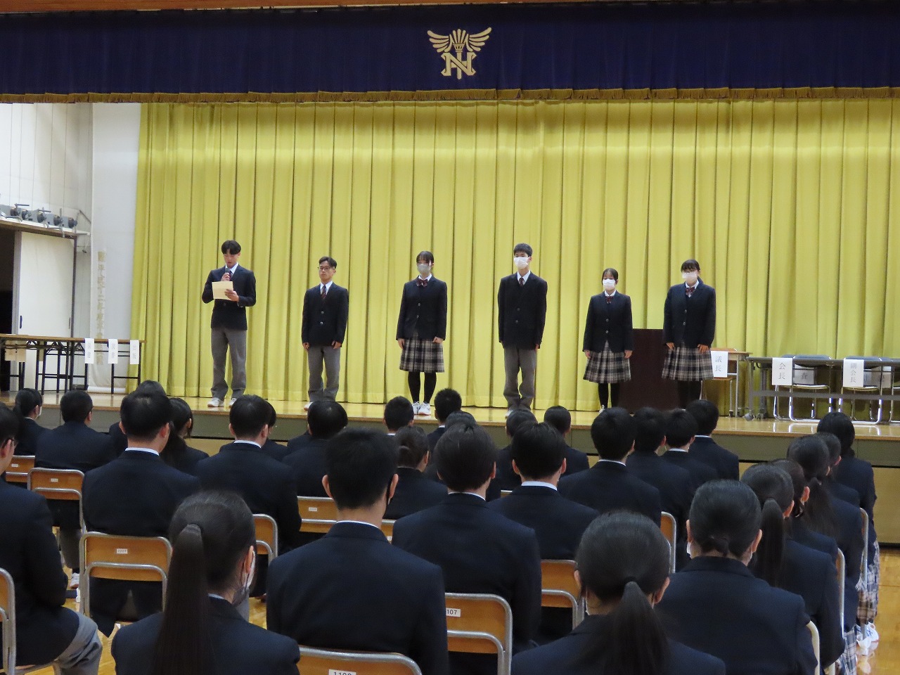 生徒会費決算中間報告などありました。その後新生徒会長の任命式や新生徒会の紹介が行われま
