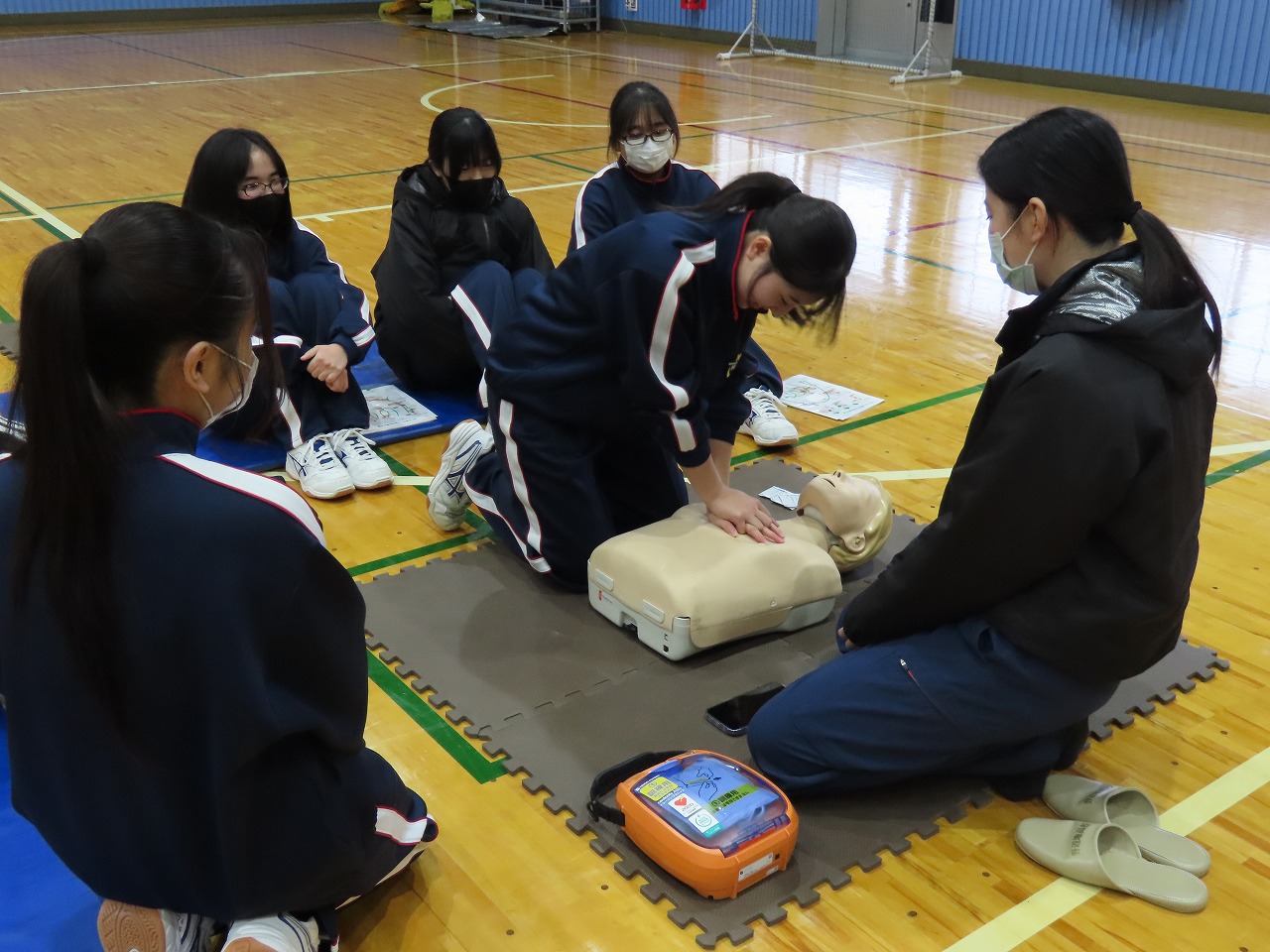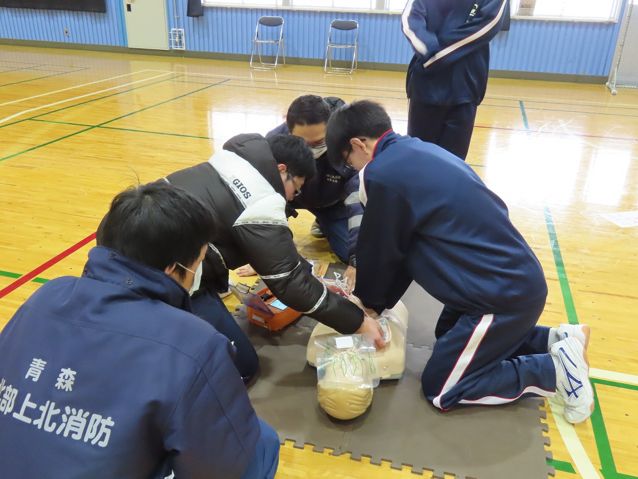 本校1学年を対象にAED講習会を行いました。野辺地消防署の方々を講師としてお招きし、