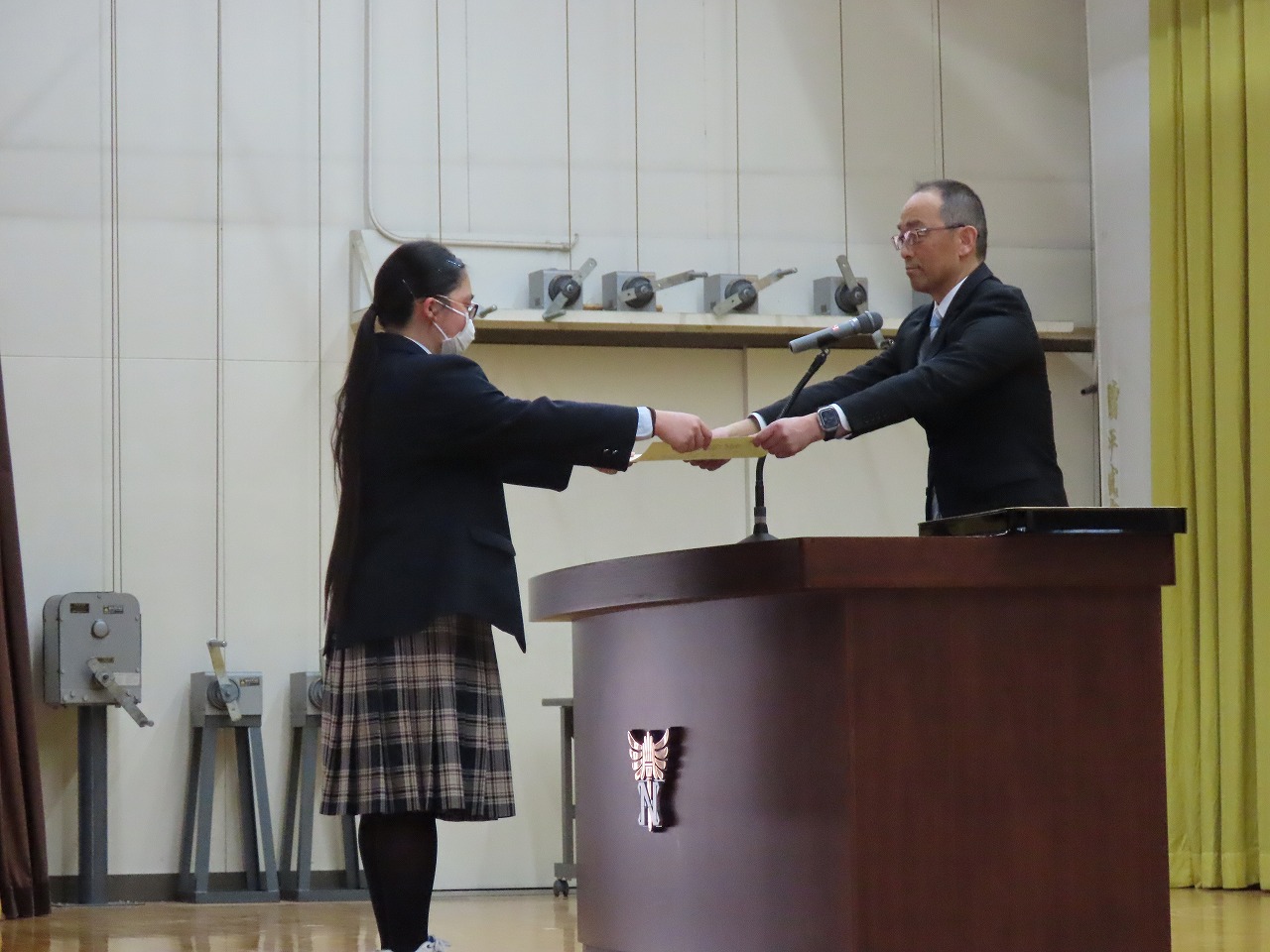 行われ、代表生徒は校長先生より賞状を立派に受け取っていました。